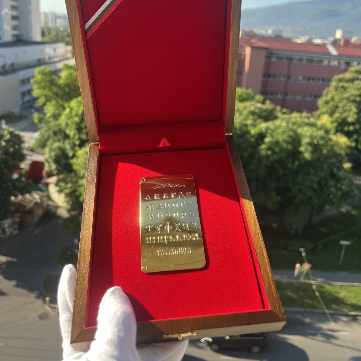 Българската азбука - позлатен луксозен сувенир на луксозна поставка и ръчно изработена дървена кутия.