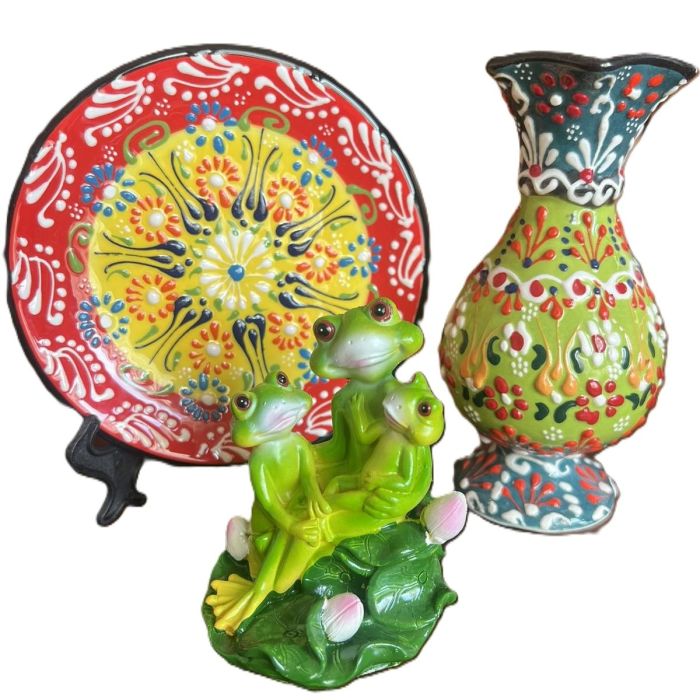 Богатство и късмет - ръчно изработен керамичен комплект от малка пластика на жаба, ваза и чиния