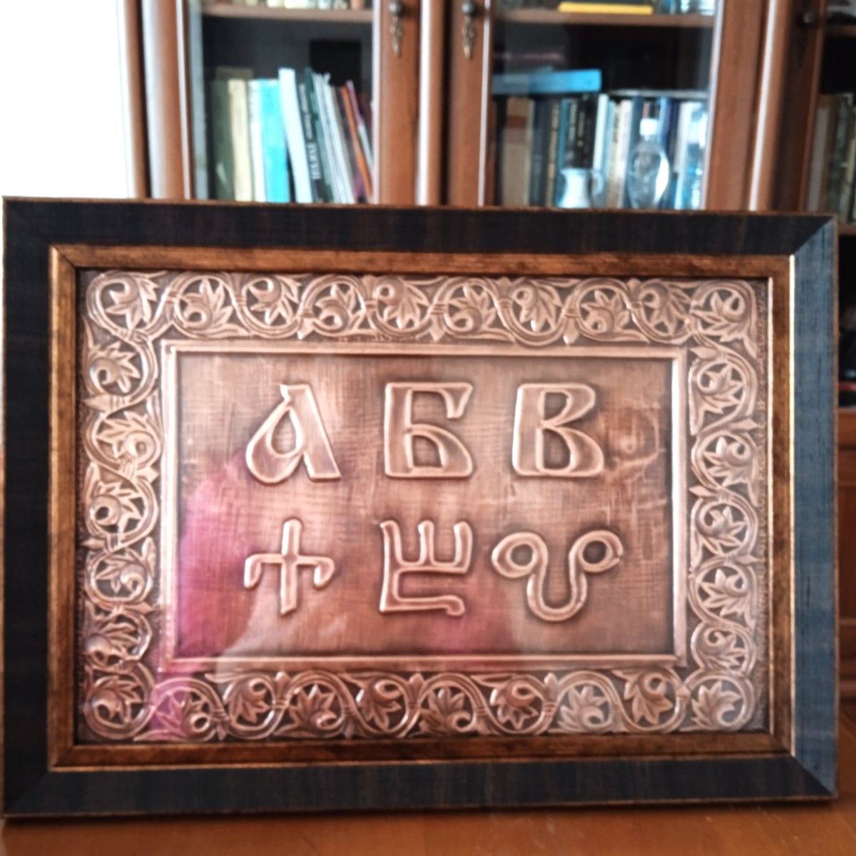 Картина от ръчно кована мед с букви та Кирилица и Глаголица и фриз, копие от Башчанската плоча