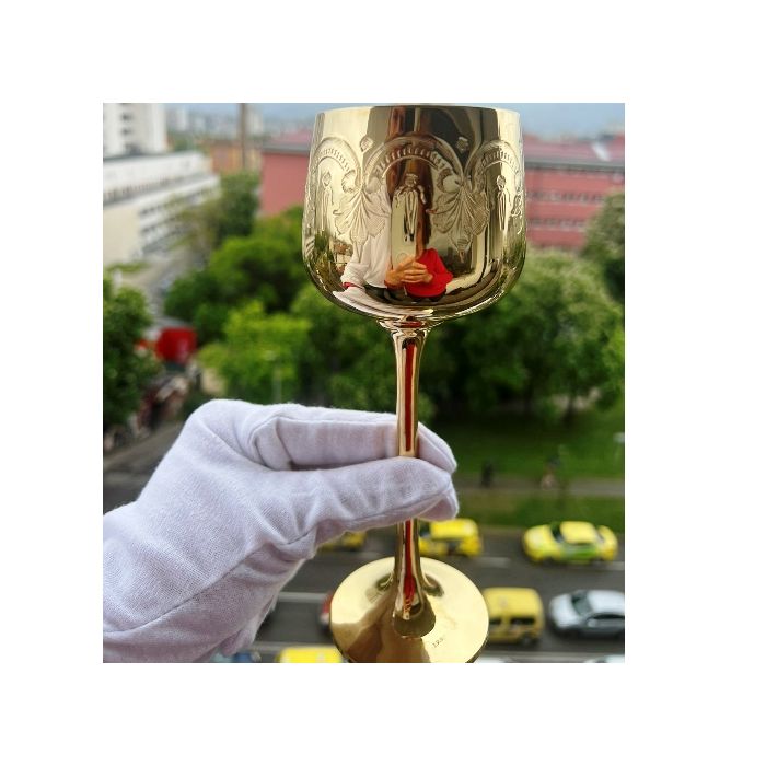 Чашата за вино е изработена от месинг в началото на ХХ век във Великобритания, посребрена е с най-висока проба сребро 999,9 и позлатен с 24 каратово злато. Оригиналната, антикварна чаша има печат на основата, който е доказателства за произхода, датировката и начина на изработка на чашата. Тази уникална антикварна чаша е майсторски посребрена с най-висока проба сребро 999,9 и позлатена със злато 24 карата.