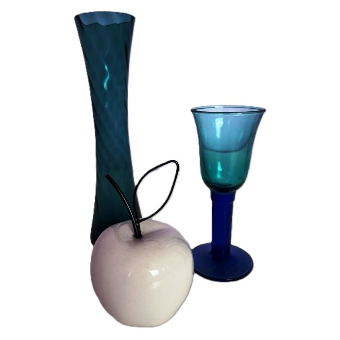 Формата и дизайна на тази чаша е вдъхновена от формата на старите стъклени съдове на нашите баби и дядовци. Красиво издължена, в наситен тюркоазено-син цвят, стъклената чаша излъчва елегантна екстравагантност и усещане за носталгично неподправен стил във всяко помещение. Датировка - произведена в 90те години на миналия век.