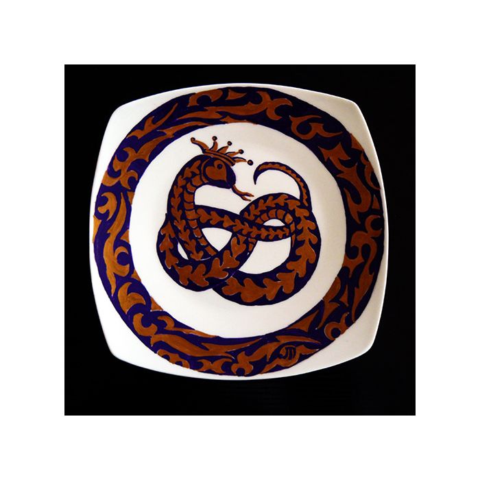 Порцеланът е рисуван със студени керамични глазури. Размерите на чинията са 18х18см.