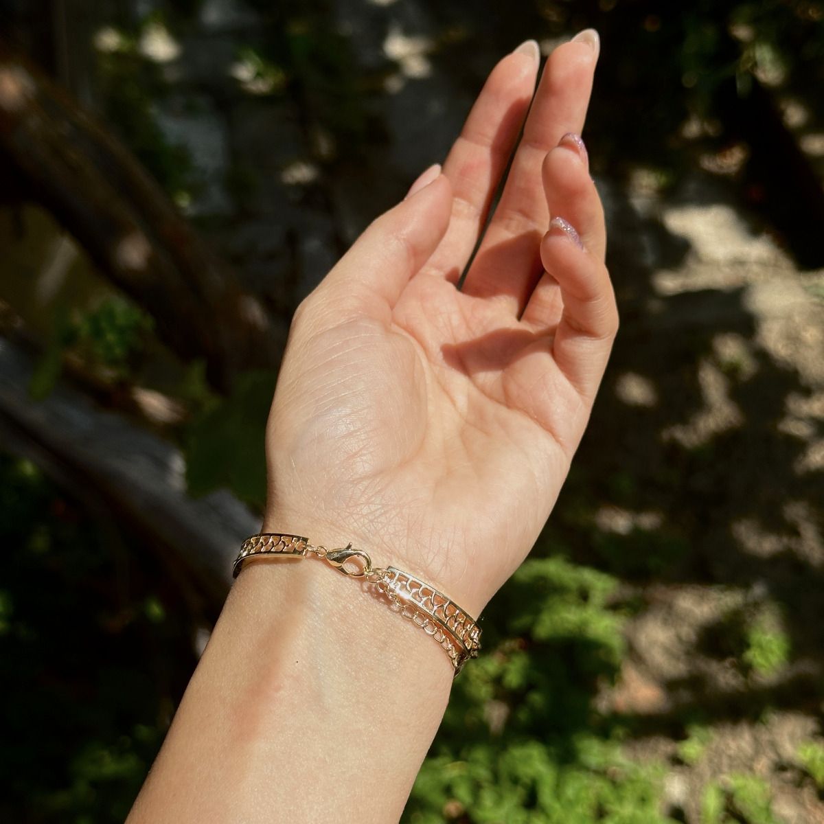 Красивата гривна е изработена от бижутерски метал с цвета и блясъка на златото. Дължината на гривната е 17 см. Теглото на гривната е 3,2 гр.