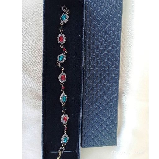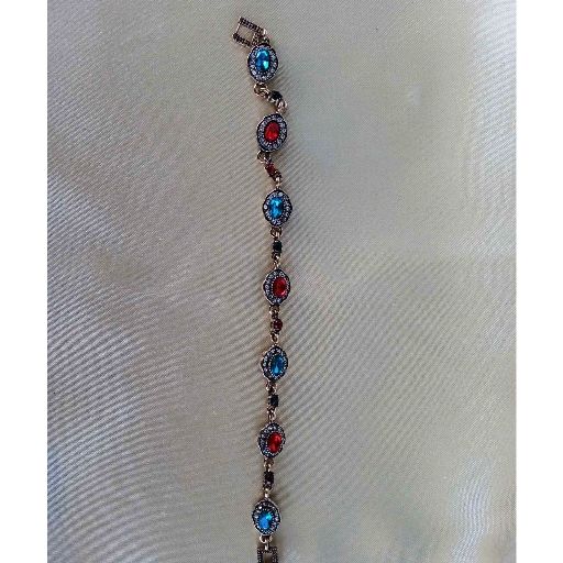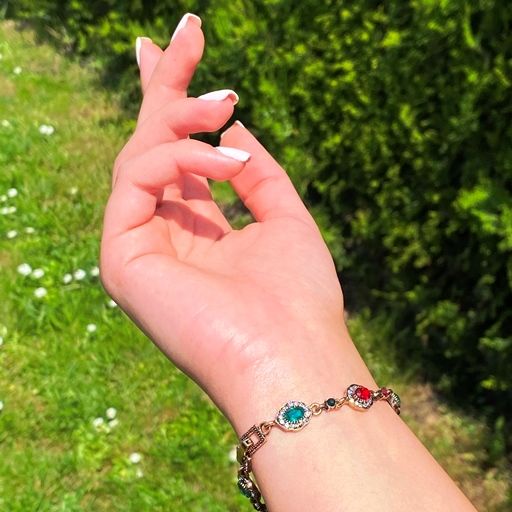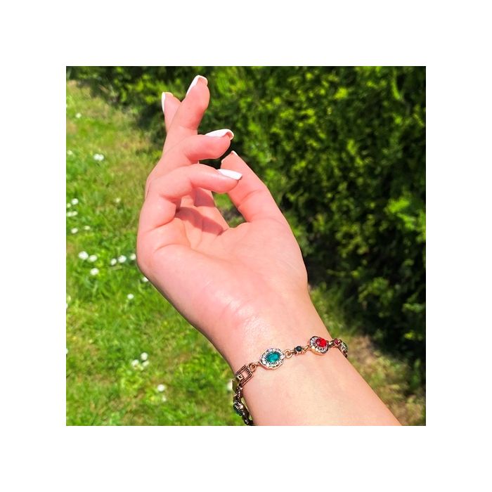 Елегантна винтидж гривна с елипси в центъра на които са поставени разноцветни камъни, които са обградени с нежни циркони.