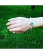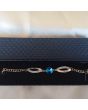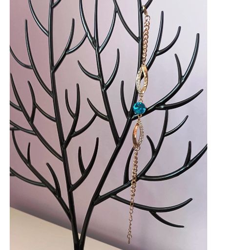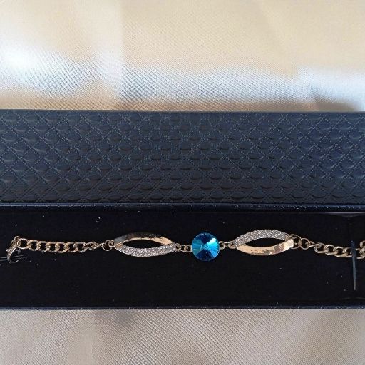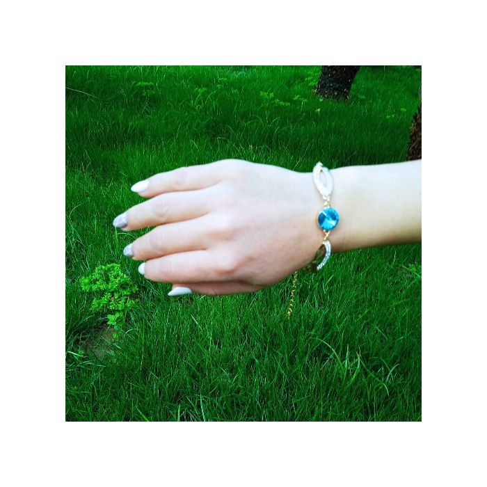 Елегантната и леко закачлива гривна е изработена от бижутерски метал. В гривната са инкрустирани син и бели кристали