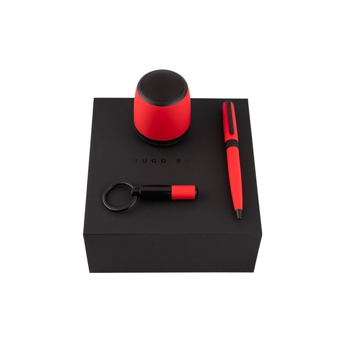 Този комплект Hugo Boss се състои от колонка, ключодържател и химикал. Изключително леката и свръхфункционална, колонката от колекцията Hugo Boss Gear Matrix е незаменим аксесоар за Вашето ежедневие. Независимо дали сте у дома, в офиса, на път или на почивка, не можете да живеете без него. Със своята технология за безжично свързване свържете всяко мобилно устройство и слушайте любимата си музика или радио, приемете обаждане и провеждайте конферентни разговори с лекота, без да се налага да използвате мобилния си телефон. Ключодържателят Gear Matrix показва контраста между лак с изтрито покритие и матови черни метални вложки с фино гравиран подпис на HUGO BOSS. Перфектно балансираният корпус на химикалката "Gear Matrix" се отличава със своя ярък цвят.