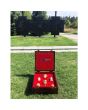 Кутията е с размери 56 см х 56 см х 23 см. Кутията е тапицирана с червено или синьо кадифе, по желание на клиента, и вътре в кутията е залепена златна табела с текст на клиента.