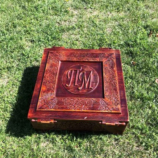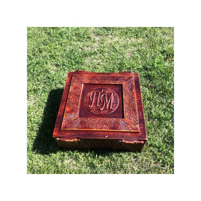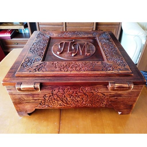 Луксозна индивидуална дървена, тапицирана кутия с дърворезба на инициалите на получателя