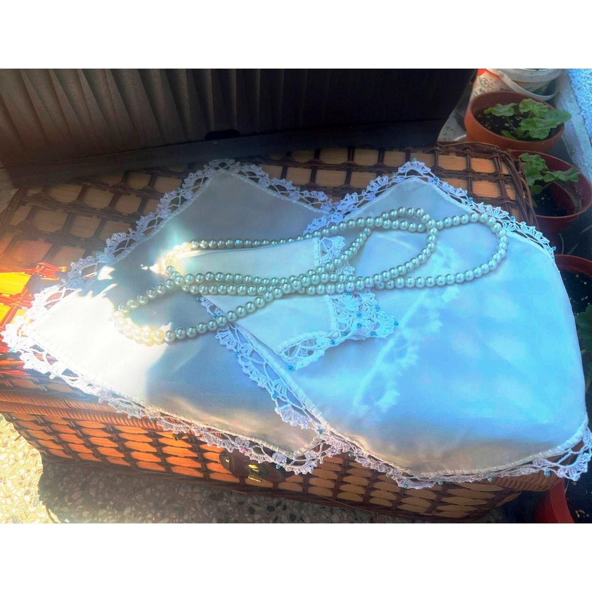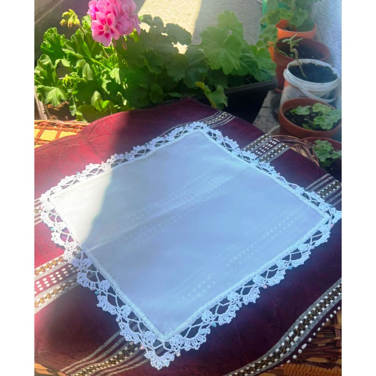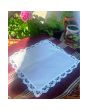 Кърпичка от бяла полиестерна сатенирана коприна, ръчно оплетена памучна дантела
