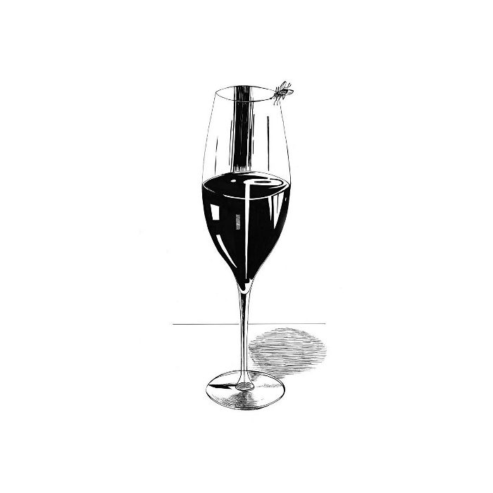 Майсторска графика, оригинал, изпълнена с много финес, елегантност и чувство за хумор! Графиката казва: Във виното е истината! Хубавото вино е толкова явно и неустоимо,че дори и мухата залепва до него като заслепена.... Както казва мъдрецът "Хубави жени - много, но чашата хубаво вино - е рядкост!"