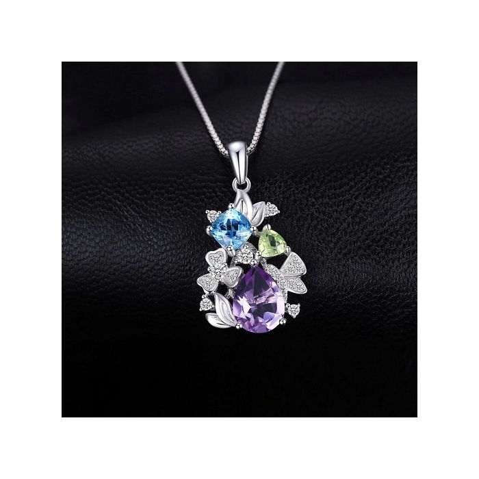 Колие от масивно сребро 925 и три невероятно красиви скъпоценни камъка – аметист, топаз и перидот. Влиянието на камъните върху човека се знаят от векове. В това съвършено бижу силата е увеличена по три! Аметистът влияе благотворно на смелостта, разума и крепкото здраве. Синият топаз въздейства на енергиите на тялото, като презарежда носещия го с късмет, радост и изобилие. А красивият перидот отговаря за сърдечната чакра, като намалява стреса, стимулира интуицията и баланссира емоциите.