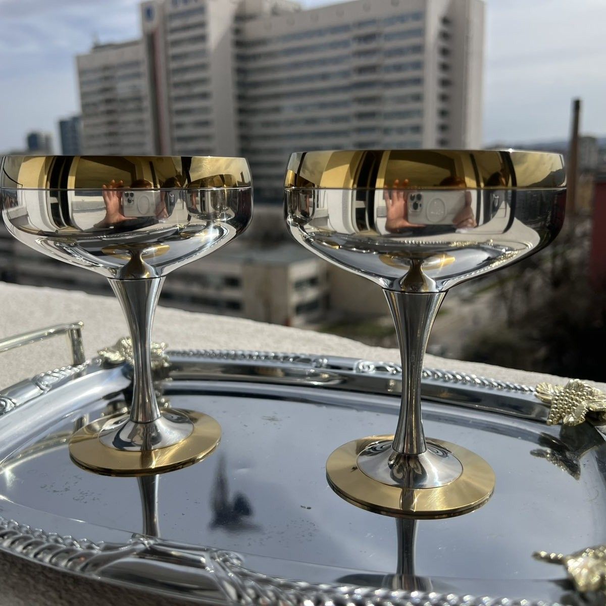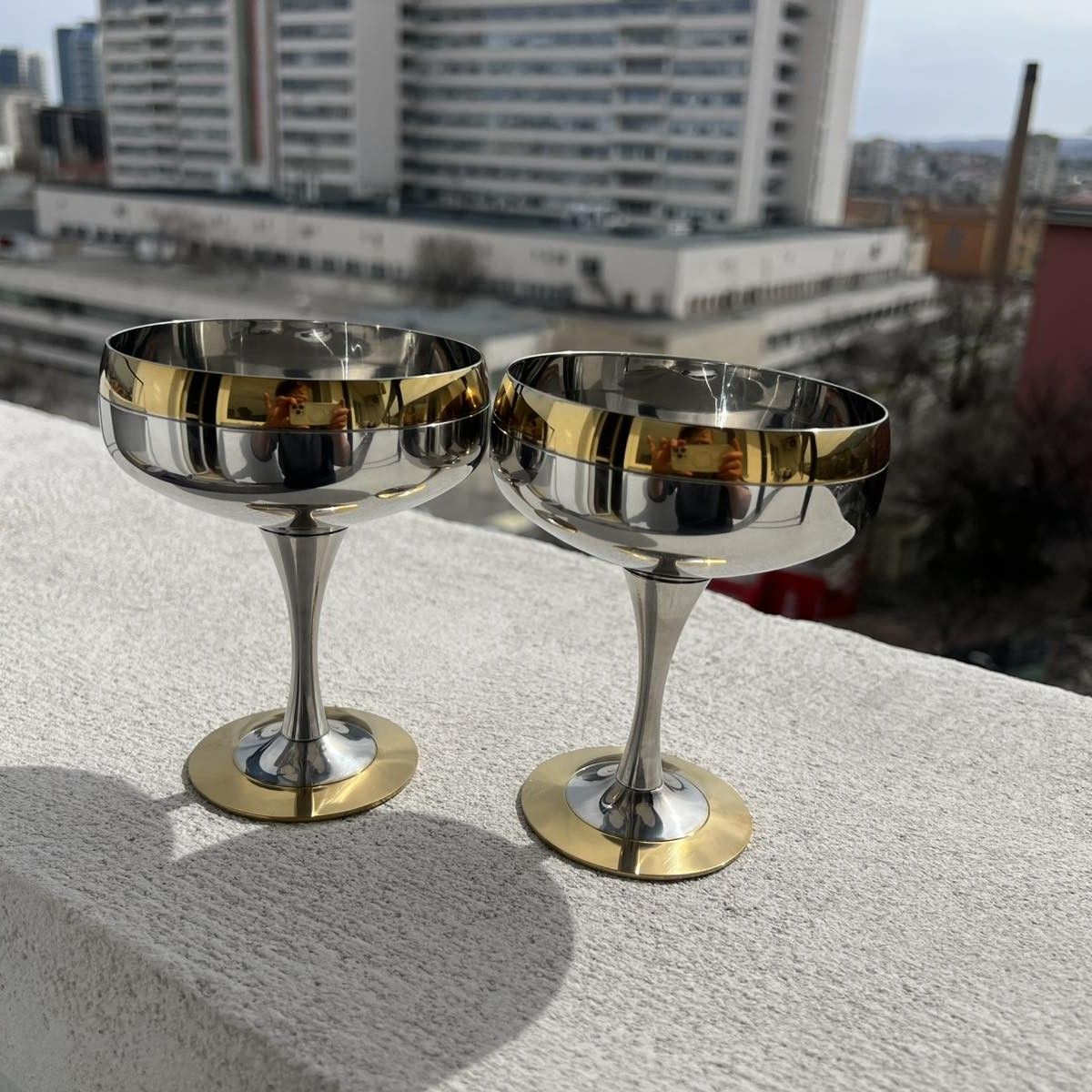 Чашите за шампанско са изработена от висококачествена неръждаема стомана със златен пръстен.
