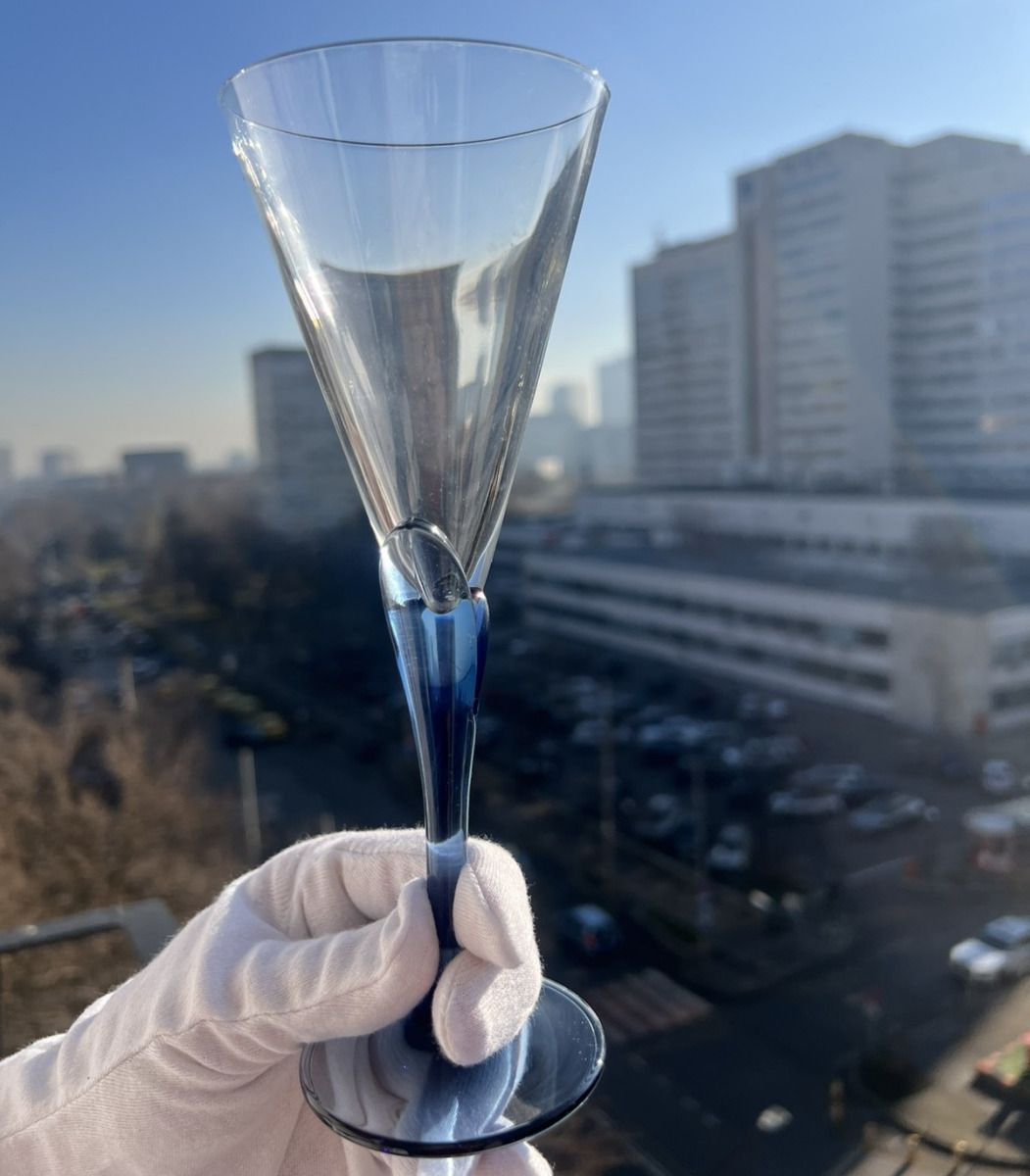 Формата и дизайна на тази чаши е вдъхновена от формата на старите аристократични чаши на европейските трапези. Красиво оформена, с идеални пропорции, във формата на лале, в нежен светло син цвят, стъклените чаши излъчват елегантна топлина и аристократичнот, с усещане за носталгично неподправен стил във всяко помещение.