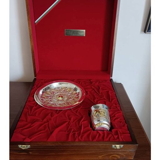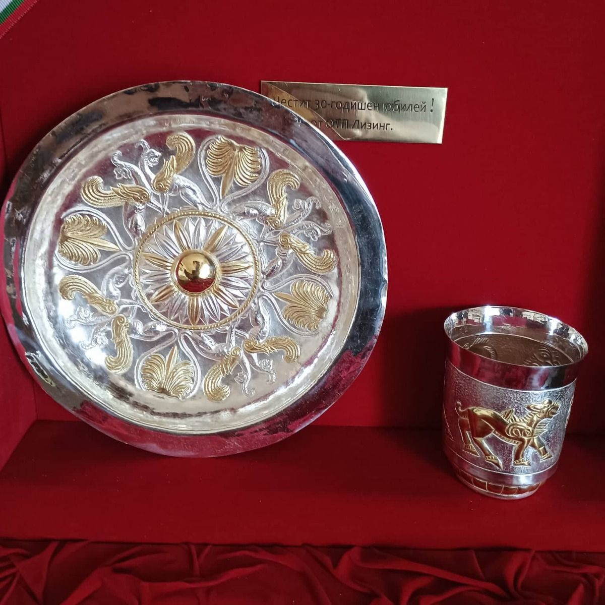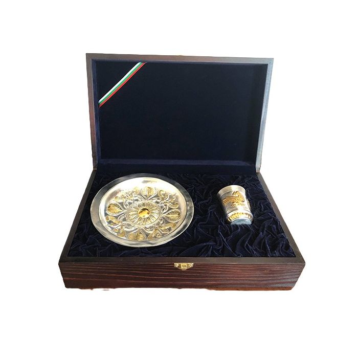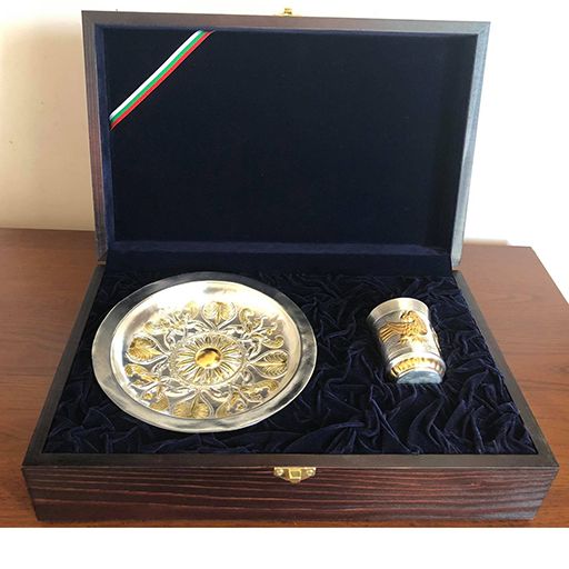 Луксозен подаръчен комплект, който се състои от репплика на сребърната фиала с грифоните от Рогозенското съкровище и сребърен бокал с тракийски ловни сцени