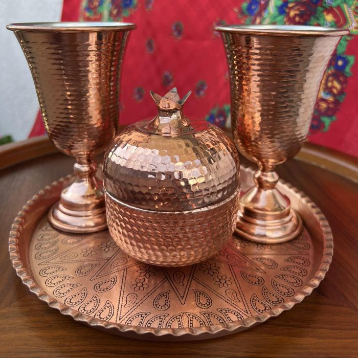 Ръчно кованият от мед комплект се състои от две ритуални чаши за вино, красив поднос и захарница във формата на нар.