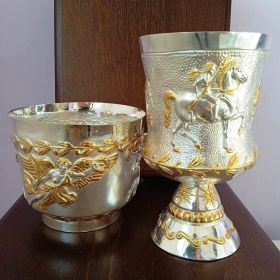 Чашата на боговете е античен сребърен бокал за вино с мотиви от Тракийските съкровища Царският бокал с ред релефни глави на антични богини и ред глави на овен и лъв е изработен като авторски модел в духа на сребърните тракийски съкровища. Царски бокал, изработен сякаш да се използва по време на царски обредни ритуали. Женските глави се определят като глави на богини глави и ред глави на животни - лъв и овен. Бокалът е изработен по галваничен път от най-висока проба сребро - 999,9и е частично позлатена с 24 карата злато. Тегло на среброто - около 120 -140 гр. Диаметър на чашата в широката част - 8 см, височина - 9,5 см. Вместимост - 300 мл.