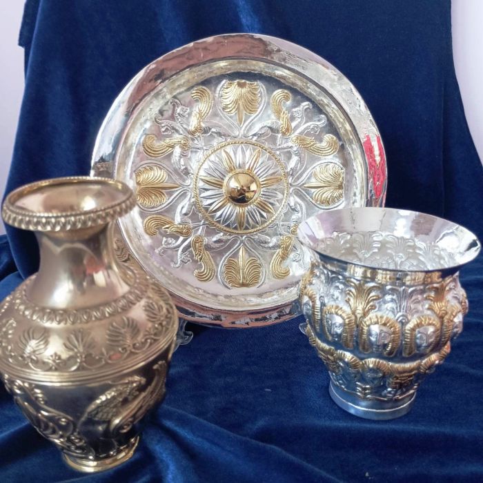 Комплект реплики на съдовете на тракийските аристократи, който се състои от фиалата с грифони, сребърна чаша на боговете и позлатена антична кана за вино с тракийски сцени