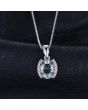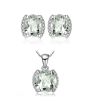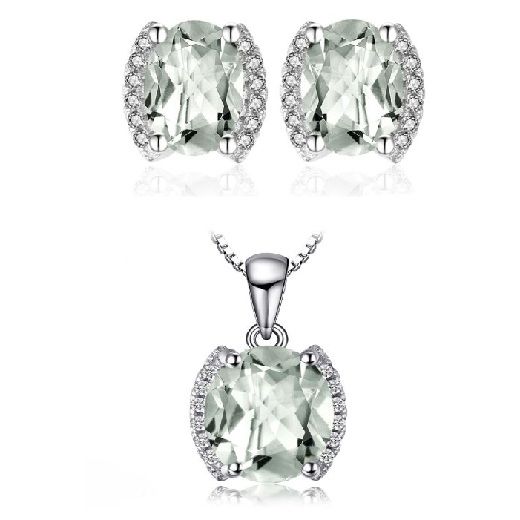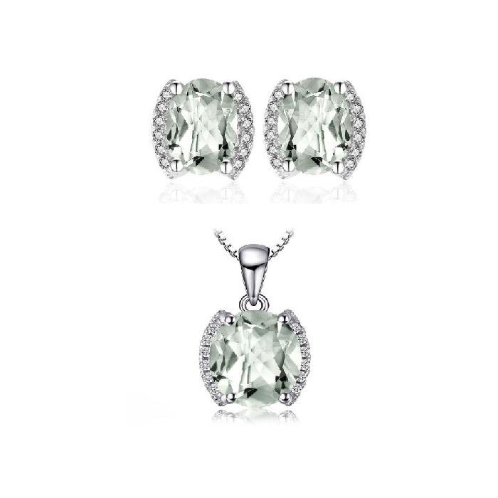 Стилен комплект, състоящ се от колие и обеци от масивно сребро 925 с естествен зелен аметист, обгърнат от бели цирконии. Скъпоценният камък е считан за талисман в любовта и водач в духовното развитие. Имас пособността да се взира дълбоко в сърцето на притежателя си и да вади на бял свят най-доброто от него. Зеленият аметист притежава пречистваща енергия, която когато се слее с тази на собственика си, това може да увеличи красивите мигове в живота, чистите помисли и добротата.