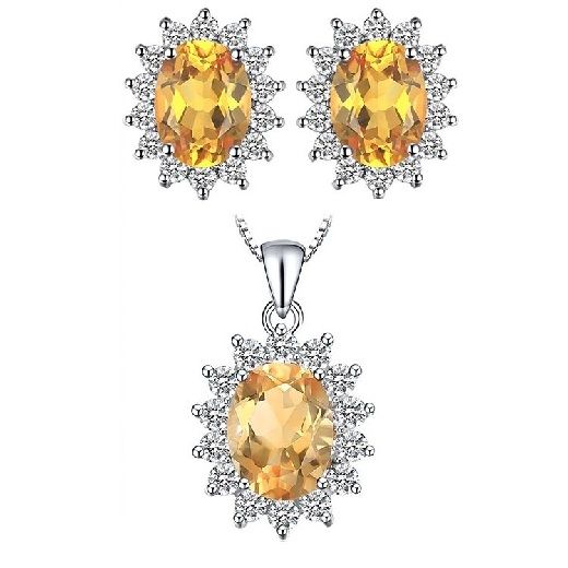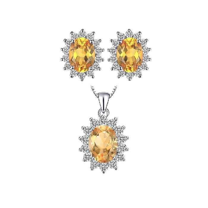 Стилен комплект, състоящ се от колие и обеци от масивно сребро 925 с естествен цитрин, с нежна овална форма и бели цирконии. Скъпоценният камък с невероятен слъчнве цвят е магнит за изобилие и богатство, предаващ на своя притежател положителната си енергия. Силата на този камък е като тази на слънцето – топла, успокояваща, даваща живот. Дава усещането за лекота и радост на своя собственик.