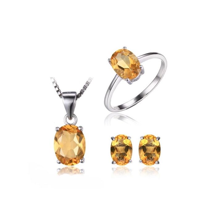 Стилен комплект, състоящ се от колие, пръстен и обеци от масивно сребро 925 с естествен цитрин, с нежна овална форма. Скъпоценният камък с невероятен слъчнве цвят е магнит за изобилие и богатство, предаващ на своя притежател положителната си енергия. Силата на този камък е като тази на слънцето – топла, успокояваща, даваща живот. Дава усещането за лекота и радост на своя собственик.