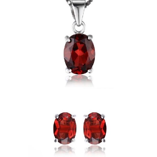 Комплект за дами, състоящ се от колие и обеци от масивно сребро 925 с общо 4,4 карата естествен гранат. Червеният скъпоценен камък е символ на любовта и приятелството. Наричан е още „камъкът на здравето“. Гранатът разпалва страстния огън в живота, като повишава креативността, сексуалността и стимулира възхода на енергията кундалини. Подпомага да се осъзнае индивидуалната отговорност по отношение на личната свобода. Този камък ще възвърне чувството за смелост, волята и издържливостта, а също ще развие чувството за собствено достойнство. Гранатът дава на собствениците си добро настроение, прогонва скръбта, носи радост, възбужда страстта на любовта и подсилва надеждата.
