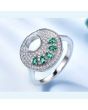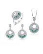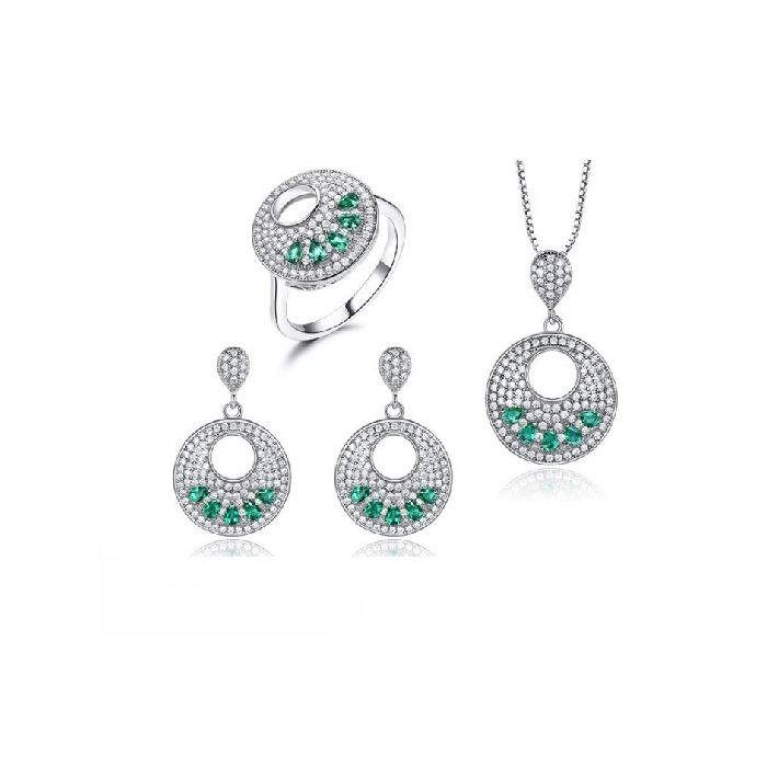 Комплект за дами, състоящ се от колие, пръстен и обеци от масивно сребро 925 с изумруди, обгърнати от нежни бели цирконии. Красивият дизайн на бижутата им придава излючителна елегантност. Скъпоценният камък изумруд е бил сред любимите на Клеопатра, като е смятан за лековит и използван за символ на безсмъртието. Хармонизира и подпомага семейното щастие и вярност. Човекът, който носи бижу с изумруд е защитен от влиянието на зли магии и е застрахован от нещастия.