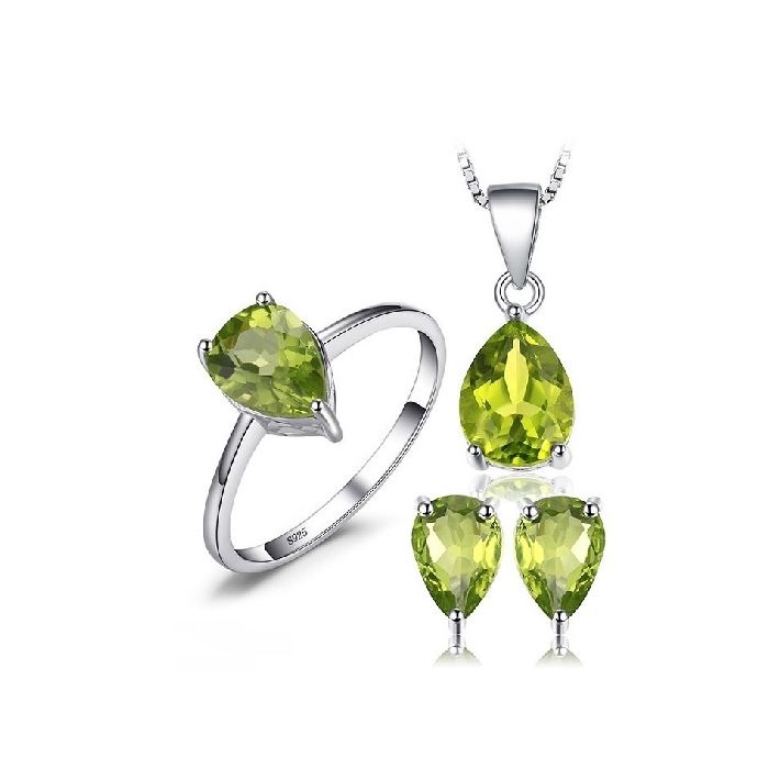 Комбинацията между стилния дизайн на всеки елемент от комплекта и ослепителният блясък на естествения зелен перидот, създават необходимата за всяко елегантно бижу хармония. Изберете скъпоценният камък, с който ще обгърнете днешното щастие!