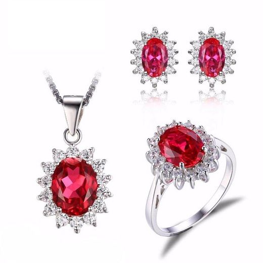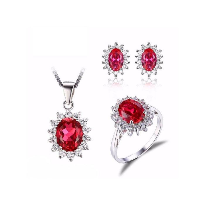 Комплект за дами, състоящ се от колие, пръстен и обеци от масивно сребро 925 с рубини и нежни бели цирконии. Мистичният скъпоценен камък с наситен червен цвят ще донесе огъня в живота Ви! Рубинът центрира фокуса в това, което е важно за носещия го. Той е вечният символ на любовта. Чудесен талисман за сближаване на хората, пазител на искрената обич, носител на мощна енергия и желанието за победа.