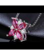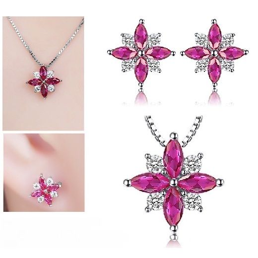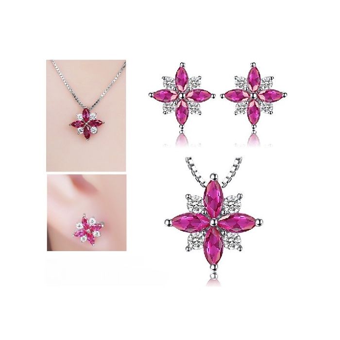 Комплект за дами, състоящ се от колие и обеци от масивно сребро 925 с рубини, бели цирконии и романтичен флорален дизайн.. Мистичният скъпоценен камък с наситен червен цвят ще донесе огъня в живота Ви! Рубинът центрира фокуса в това, което е важно за носещия го. В древността се е смятало, че този скъпоценен камък има магически и лечителски свойства. Той е вечният символ на любовта. Чудесен талисман за сближаване на хората, пазител на искрената обич, носител на мощна енергия и желанието за победа.