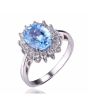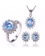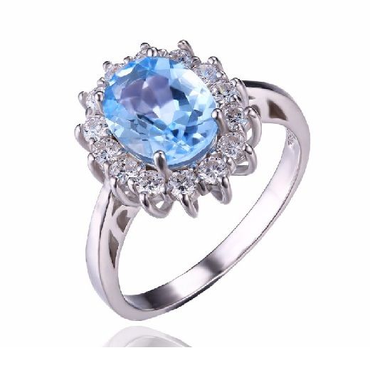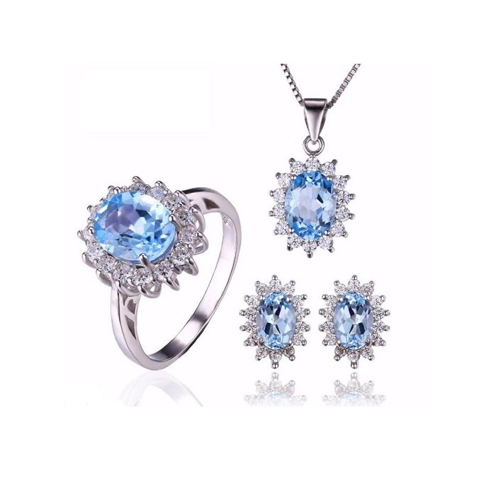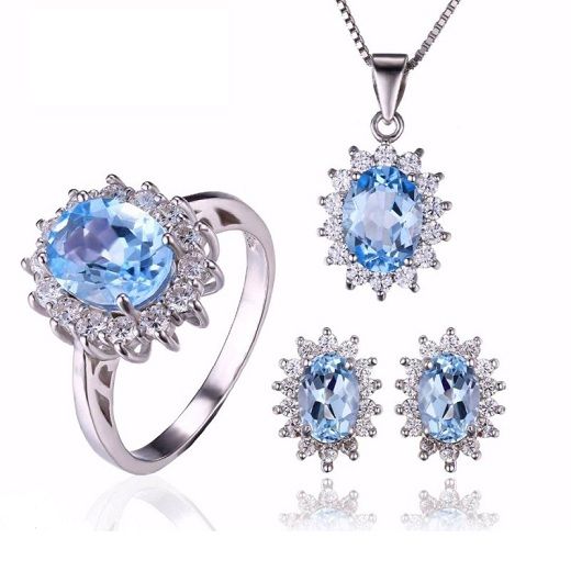 Стилен комплект, състоящ се от колие, пръстен и обеци от масивно сребро 925 с естествени сини топази, обгърнати от бели цирконии. Името му произлиза от древното название на остров Зебергет в Червено море – Топазос. Смята се, че човек, който носи скъпоценният камък е винаги оптимистично настроен, в състояние е да се радва на живота и да се наслаждава на вътрешното си спокойствие. Дарява на жените красота, привлича чистата любов в живота и сбъдва желанията им. Символизира добротата и може да неутрализира негативната енергия, а хората, които го носят са възнаградени с късмет.