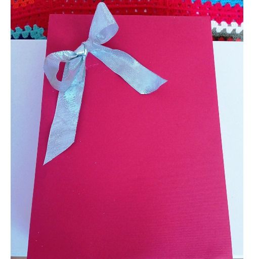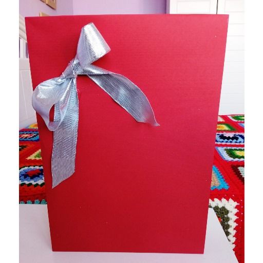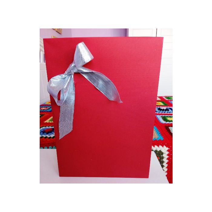Кутията е изработена от червен картон /картонът не е твърд и не е подходяща за пренасяне със самолет/ . Кутията е с размери 36 см х 26 см х 4 см. Подходяща за опаковка на бродирани албуми и шалове.