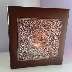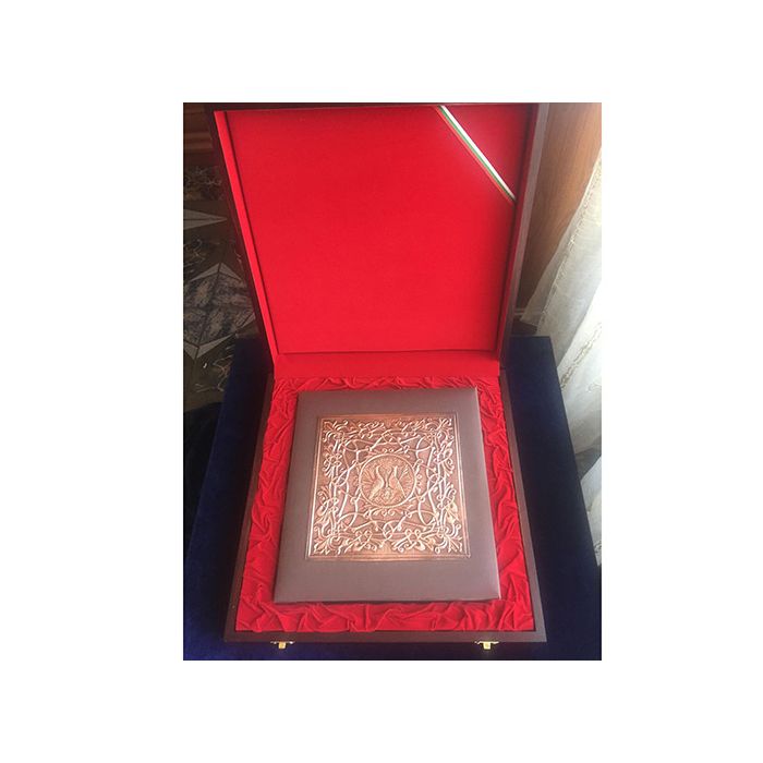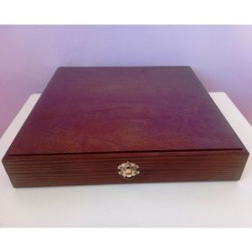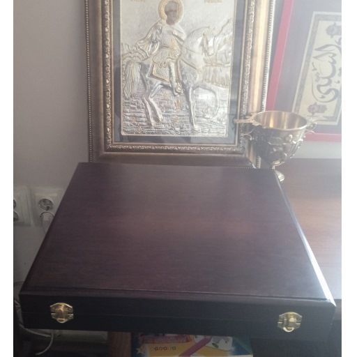 Кутията е с размери 35 см х 32 см х 10см. Кутията е тапицирана с червено или синьо кадифе, по желание на клиента.