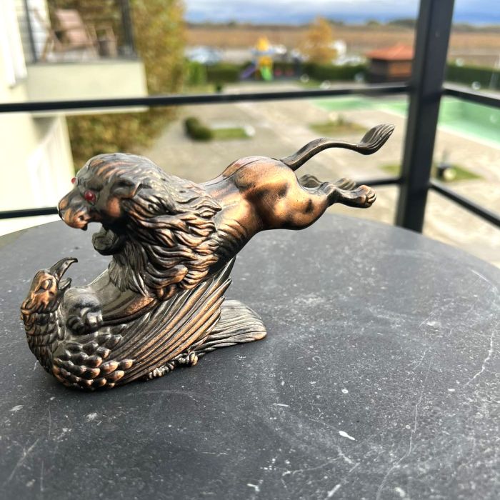 Малка пластика - Царят на силата, лъва побеждава орела в двубой