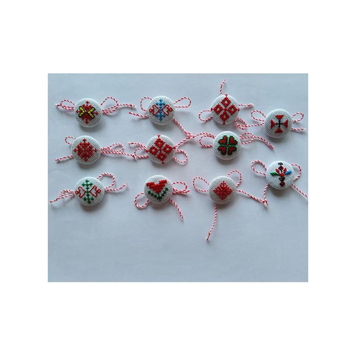 Оригинална мартеница във формата на копче, с бродирана българска шевица
