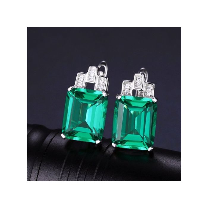Луксозни обеци от масивно сребро 925 с изумруди с добавени естествени бели цирконии за ослепителен блясък. Скъпоценният камък с невероятен зелен цвят притежава множество магични и лечебни свойства. Използван като талисман и пазител на своя притежател, изумрудът подобрява интуицията, връща позитивния поглед над живота. Наричан е „камъкът на дълголетието и безсмъртието“. Символ е на богатството, късмета и успеха.