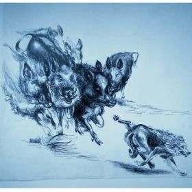 Детайлна изработка на ловец с всичките ловзжийски такъми, с любимото куче, тръгнал да се посвети на своята страст - лова.