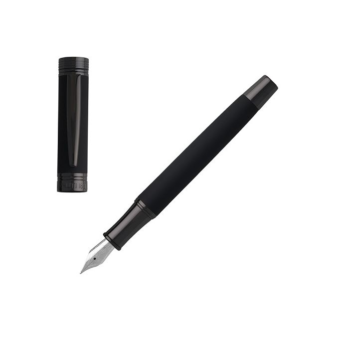 Писалка с емблематична визия с меко на допир черно покритие и лъскави метални линии.