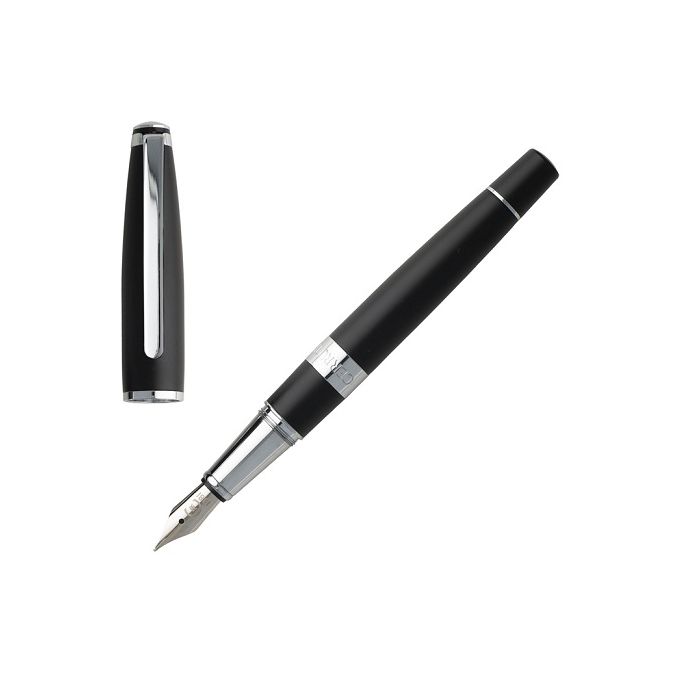 Модерна писалка с елегантен черен корпус и лъскави хромирани детайли.