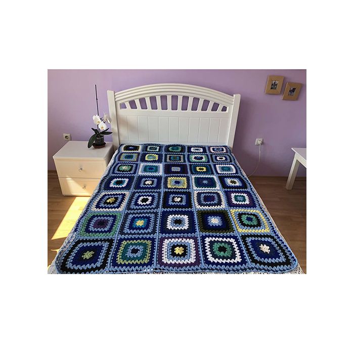 Носталгия по морския бриз, по вълните, по чашата вино с близък човек, наметнати с одеялото на надеждата, спомените и мечтите. Състои се от 35 абсолютно различни бабини квадрати, всяко от тях изплетено от 5 различни цвята. За изплитането на одеялото са използвани много различни цветове в син нюанс . Съставът на преждата, от която е изплетено одеялото е Акрил и вълна. Размерът на одеялото е 160 см на 128 см. Теглото му е около 1,5 кг и е подходящо за единично легло.