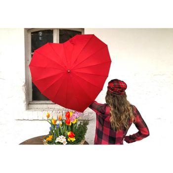 Червен чадър във формата на сърце, с който можеш да кажеш "Обичам те"