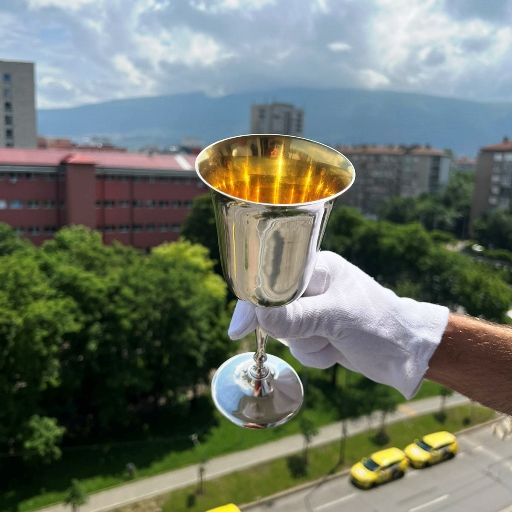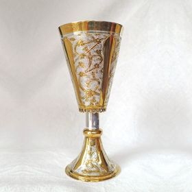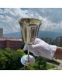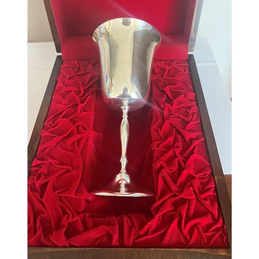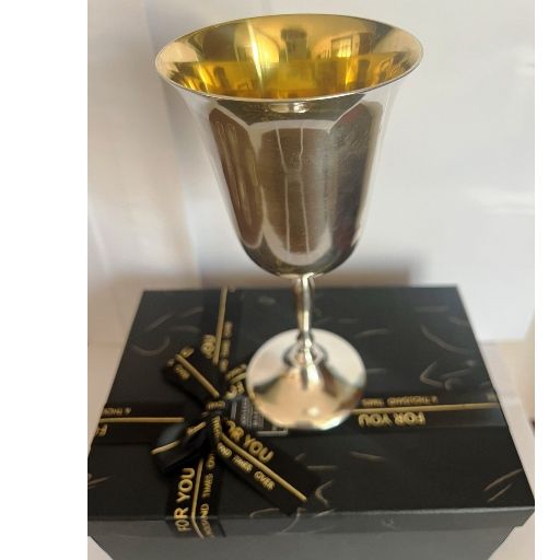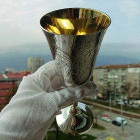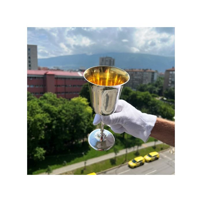 Бокалът за вино е изработен от месинг в началото на ХХ век във Великобритания, посребрен е с най-висока проба сребро 999,9 и позлатен с 24 каратово злато. Оригиналната, антикварна чаша. Този уникален антикварен бокал е майсторски посребрен с най-висока проба сребро 999,9 и позлатен със злато 24 карата.
