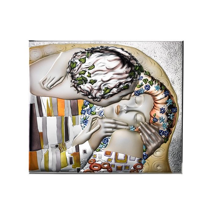 Характерното съчетание на златните тонове от оригиналната картина на Климт е запазено и емоционалното внушение на картината е предадено в посребрената картина, Целувката
