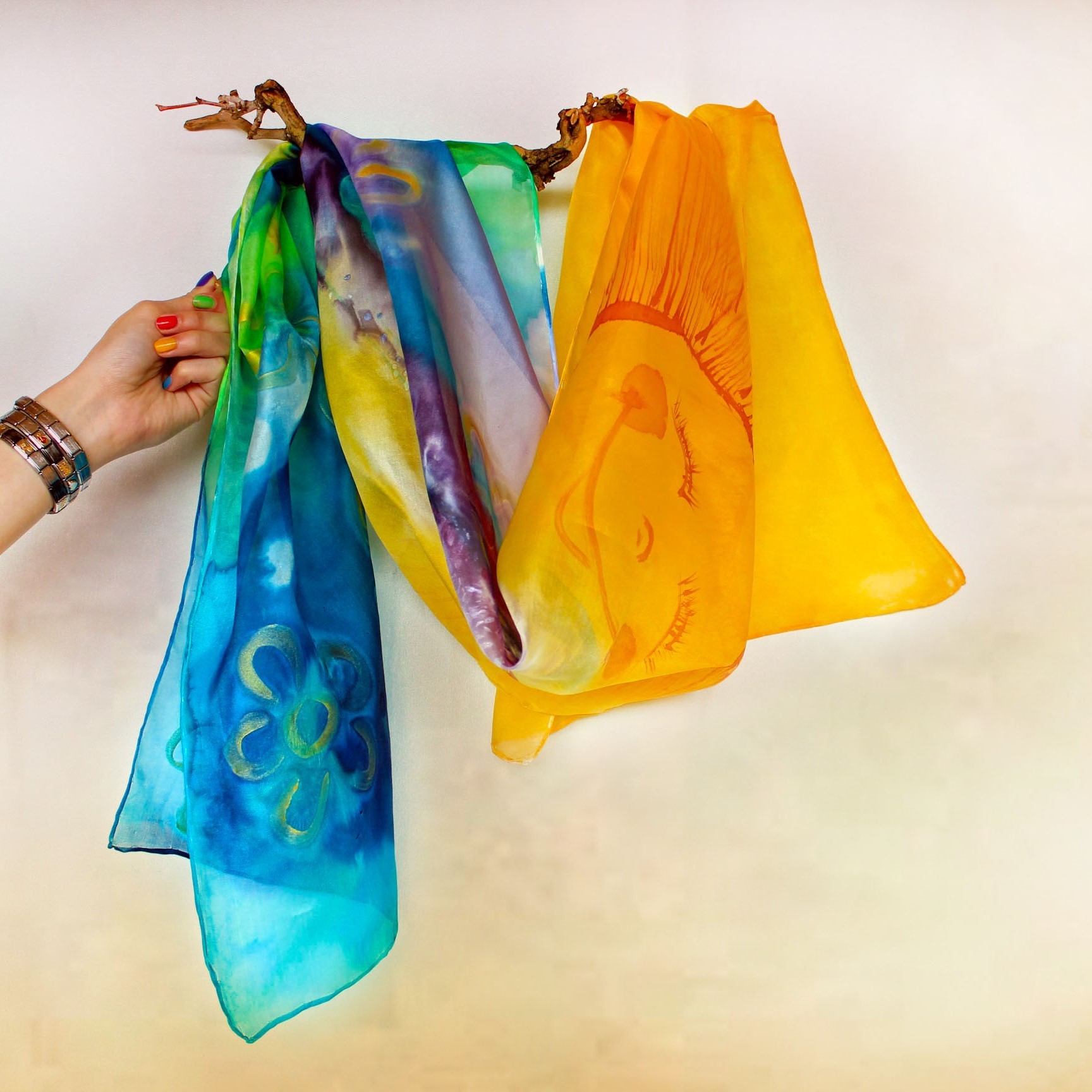Ръчно рисуван шал от 100% естествена коприна "Стилизирани цветя с пеперуди"