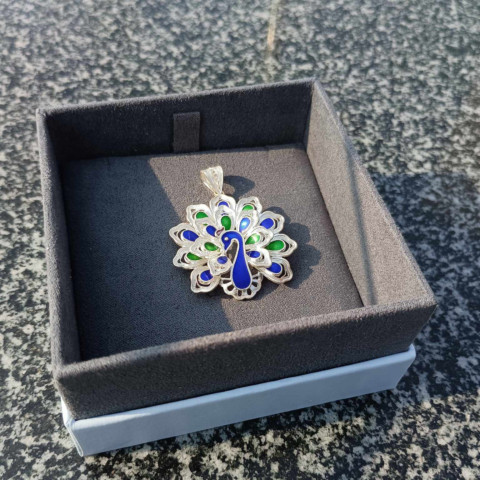 Сребърно колие, паун - птицата на щастието, ръчно изработено с ювелирната техника филигран и цветен емайл