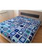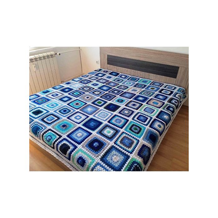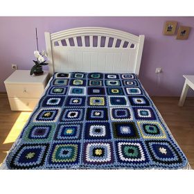 Ръчно плетено многоцветно одеяло на една кука от различни нюанси на синьо, бяло и лилаво. Одеялото е изплетено от 90 абсолютно различни бабини квадрати. Преждата е 100% Акрил, Акрил и В. Размерът на одеялото е 240 см на 225 см. Одеялото е подходящо за голяма спалня.