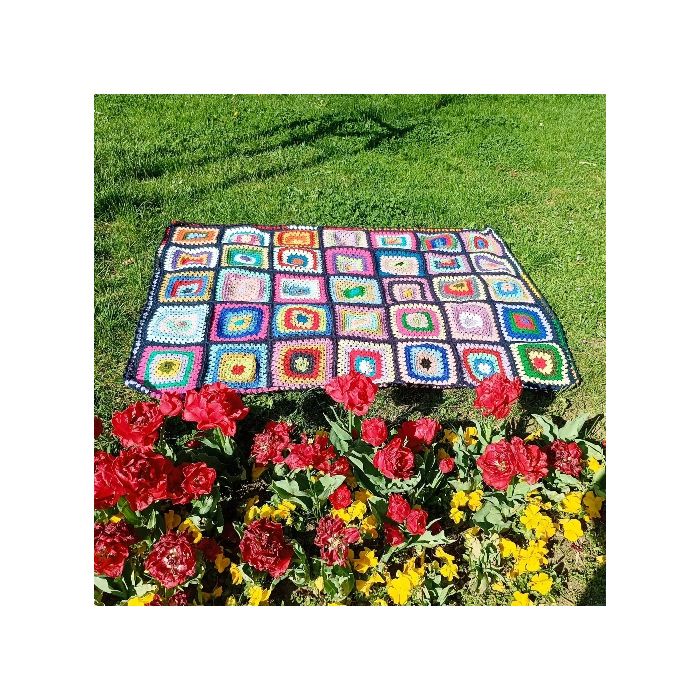 Оригинално ръчно плетено одеяло на една кука. Изработено е от 35 абсолютно различни бабини квадрати, с над 20 различни цвята прежда. Съставът на преждата е Акрил, В/Акрил и мохер. Подходящо покривало за единично легло. Шарено одеяло за пикник и за извънградска къща. Тези одеяла често се поръчват от наши клиенти при пътуване със самолет или дълги путувания с автобус. Красиво , топло, приказно одеяло.