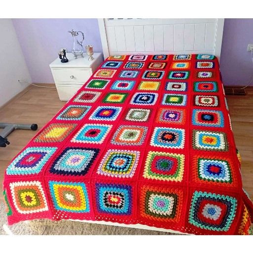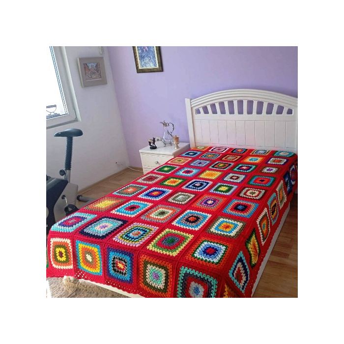 Одеалото на баба, плетено на една кука. Това одеяло е изплетено от една баба, която много обича своята внучка. Всяко квадратче, всеки бод е изплетен с пожелания и молитви за здраве, щастие, изобилие, любов, успехи и вдъхновение! Оделото е изплетено от 63 абсолютно различни и неповтарящи се цветни квадрати. Разноцветните квадрати са изплетени на една кука от над 25 цвята прежда. Размерите на одеалото са 2,25 м на 1,80 м и може да бъде постлано върху легло персон и половина или спалня. Всяко одеало е уникално. Одеялото на първата снимка е налично