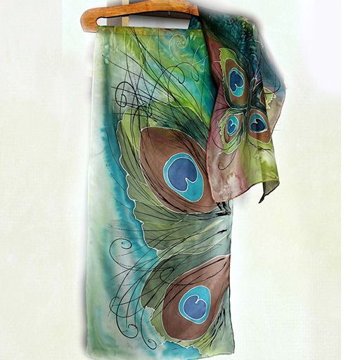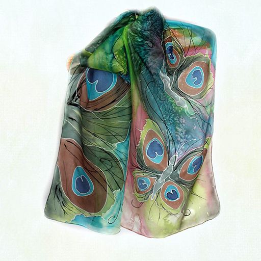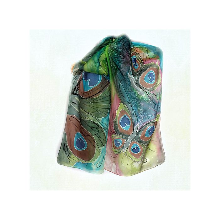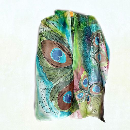 Магия от паунови пера, оформени като пеперуда - ръчно рисуван шал от 100% коприна, съчетал магията на пауновото перо и красивата пеперуда...