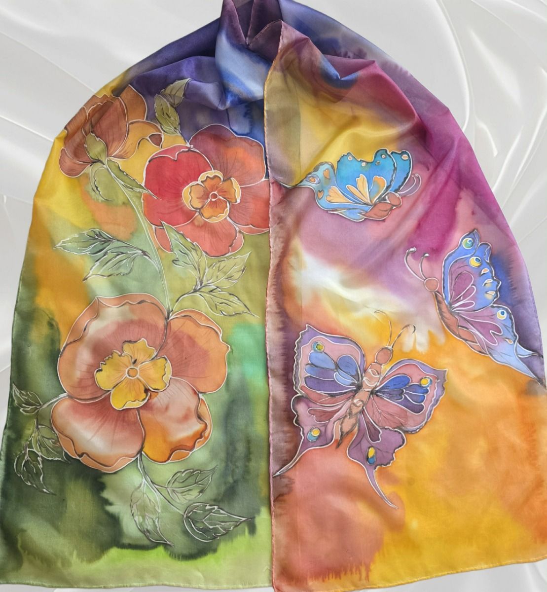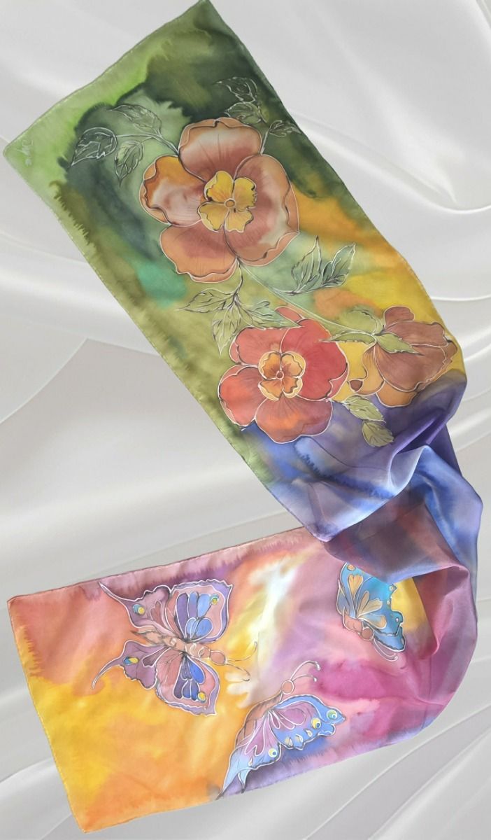 Ръчно рисуван шал от 100% естествена коприна "Стилизирани цветя с пеперуди"