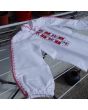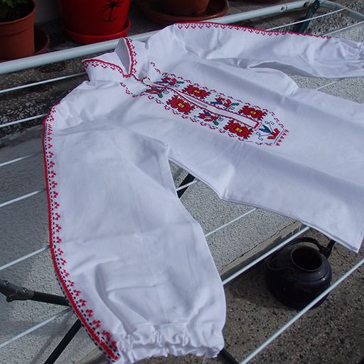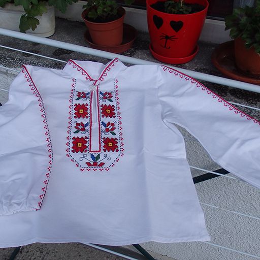 Тази риза за млад джентълмен бе избродирана по поръчка на наша редовна клиентка за сватбата на дъщеря й в Обединеното кралство. Булката и всичките внуци на нашата клиентка бяха облечени в дрехи с българска бродерия